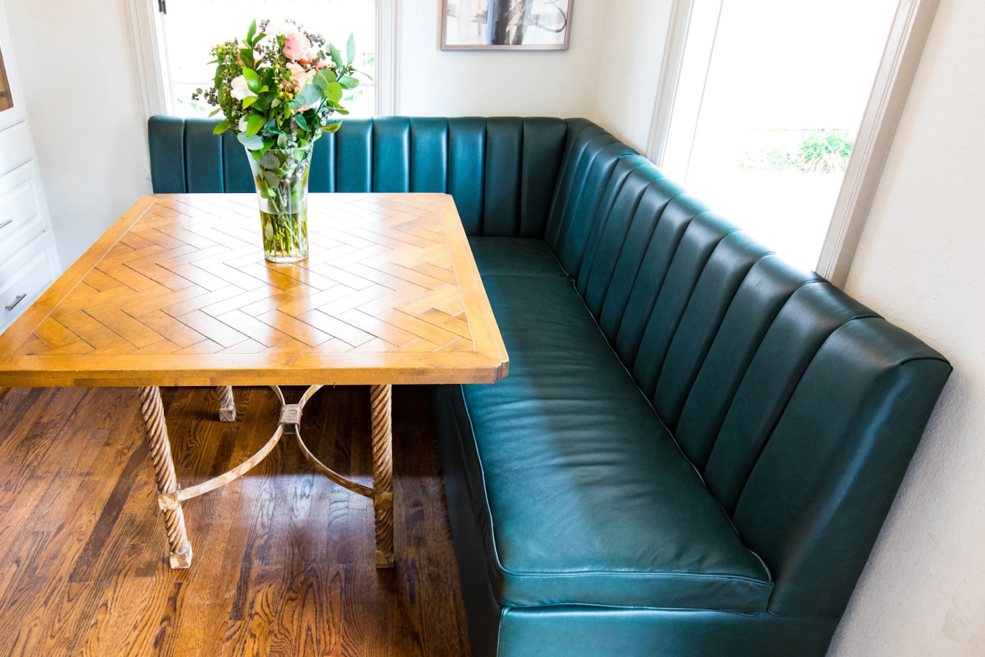 For intimate gatherings, a custom banquette maximizes seating while creating an inviting nook that brings people together naturally. A banquette is an upholstered bench that mimics a booth. It can be placed along walls to create more seating space in dining areas where people can sit closer together.
