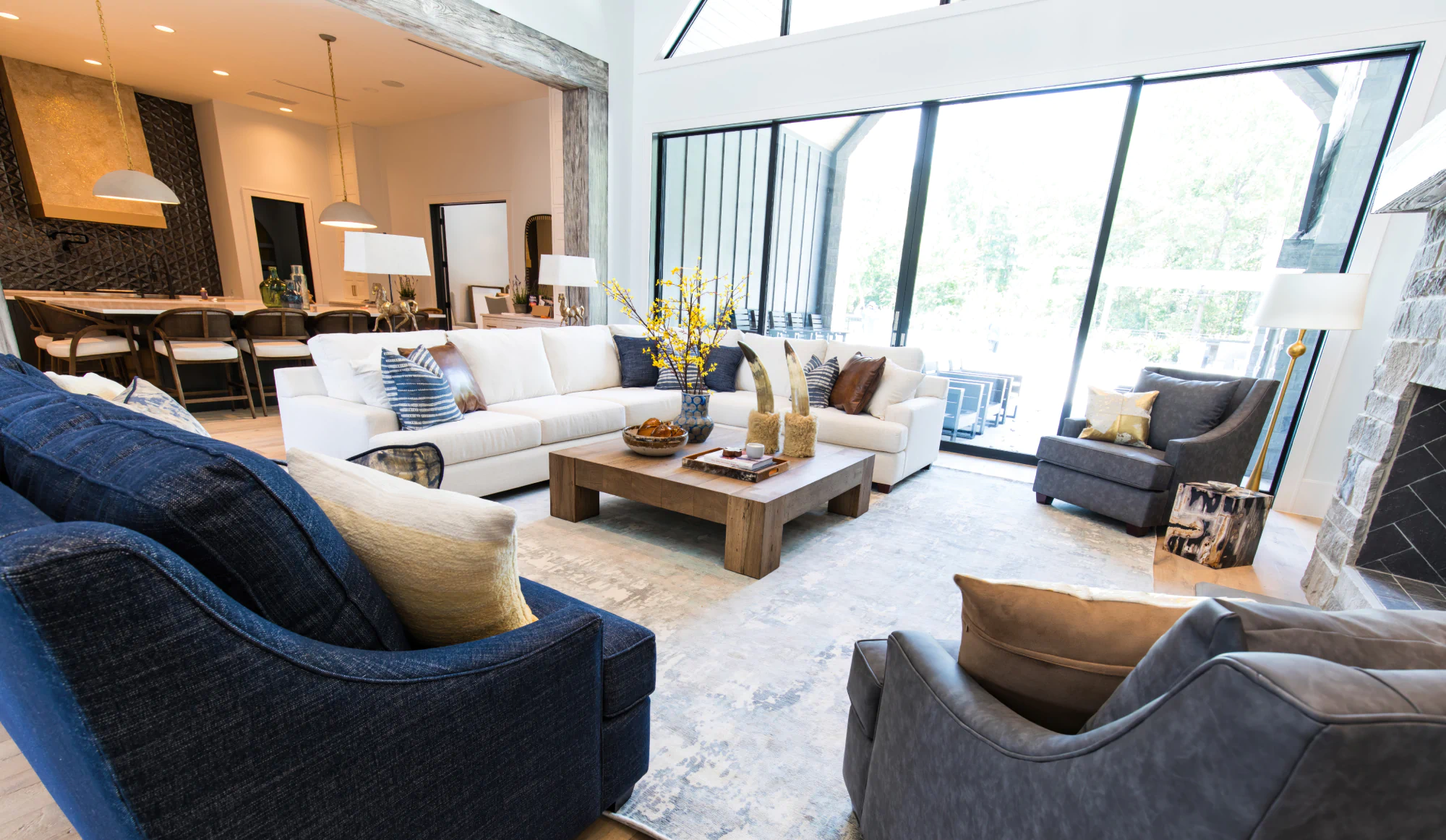 Even when pieces don't match, they should feel like they belong together through similar proportions and equally high-quality construction. Here we have a beautiful white corner sectional, two matching charcoal armchairs, and one beautiful deep blue sofa. Throw pillows with similar colors really pull the space together without the pieces looking like a set.